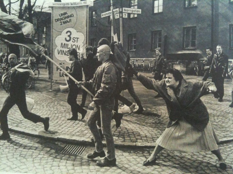 A woman hitting a neo-nazi with her handbag, Sweden, 1985. The woman was reportedly a concentration camp survivor.
